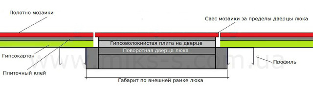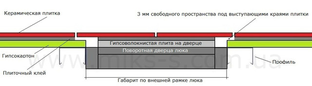 Для виготовлення кришок дверцят люка використовуються плити ГВЛ (Гіпсоволокнисті листи), які за своїми характеристиками перевершують гіпсокартон у міцності, а також ідеально підходять для кладання плитки верх кришки люка.